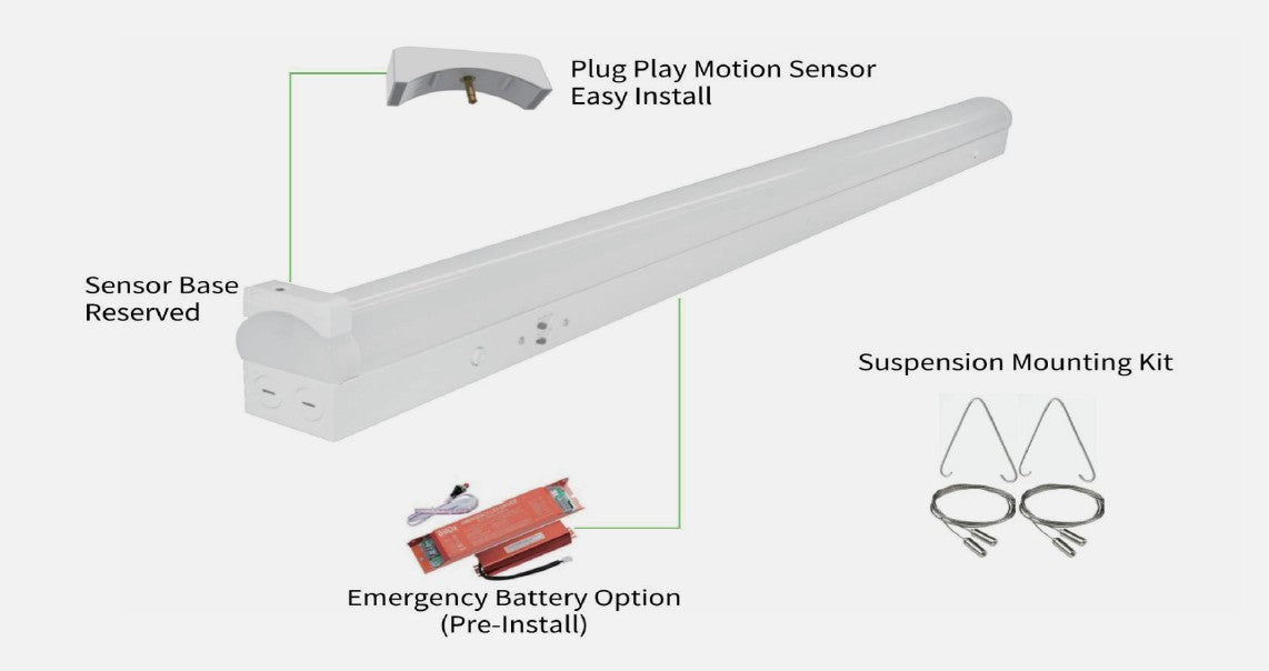 Our LED strip fixtures provide suitable lighting without the maintenance issues associated with fluorescent strip fixtures. Installation is quick and simple when mounting on the surface of the ceiling, and occupancy sensors are easily installed via a plug in port on the end of the fixture. No additional wiring required.